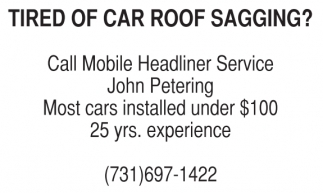 TIRED OF CAR ROOF SAGGING? Call Mobile Headliner Service John Petering Most cars installed under $100 25 yrs. experience (731)697-1422
