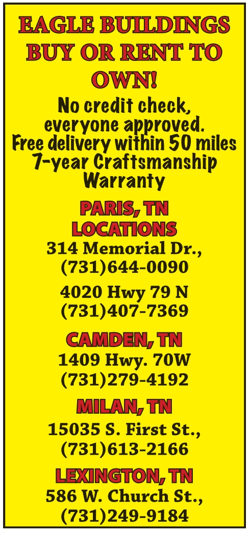 EAGLE BUILDINGS BUY OR RENT TO OWN! No credit check, everyone approved. Free delivery within 50 miles 7-year Craftsmanship Warranty PARIS, TN LOCATIONS 314 Memorial Dr., (731)644-0090 4020 Hwy 79 N (731)407-7369 CAMDEN, TN 1409 Hwy. 70W (731)279-4192 MILAN, TN 15035 S. First St., (731)613-2166 LEXINGTON, TN 586 W. Church St., (731)249-9184