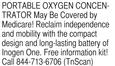 PORTABLE OXYGEN CONCEN- TRATOR May Be Covered by Medicare! Reclaim independence and mobility with the compact design and long-lasting battery of Inogen One. Free information kit! Call 844-713-6706 (TnScan)