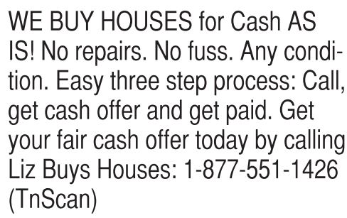 WE BUY HOUSES for Cash AS IS! No repairs. No fuss. Any condition. Easy three step process: Call, get cash offer and get paid. Get your fair cash offer today by calling Liz Buys Houses: 1-877-551-1426 (TnScan)