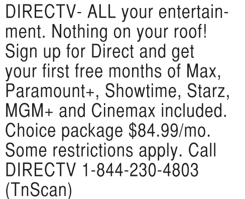 DIRECTV- ALL your entertainment. Nothing on your roof! Sign up for Direct and get your first free months of Max, Paramount+, Showtime, Starz, MGM+ and Cinemax included. Choice package $84.99/mo. Some restrictions apply. Call DIRECTV 1-844-230-4803 (TnScan)