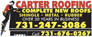 CARTER ROOFING COMPLETE NEW ROOFS SHINGLE • METAL • RUBBER OVER 30 YEARS IN BUSINESS 731-247-3086 Cell 731-676-0267
